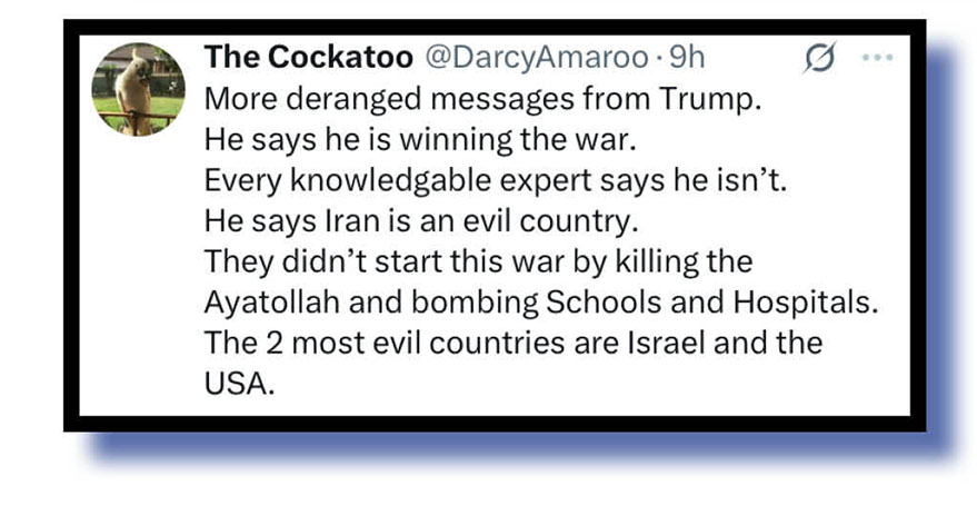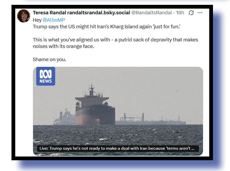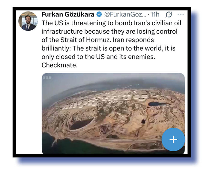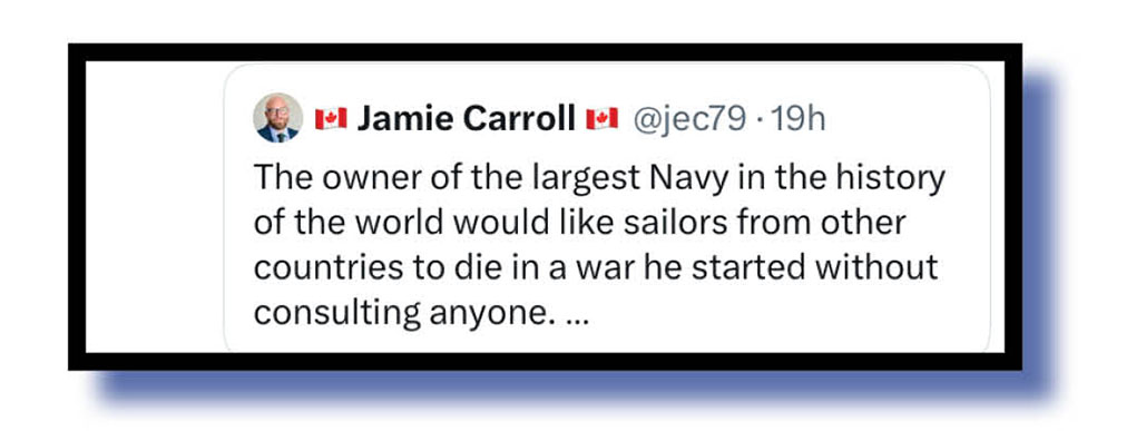 BrooklynDadDefiant mentioned the Strait of Hormuz before so let’s hear now from Xcretas who poked virtual poo at the Orange Oaf for declaring the war won many times over the past fortnight and all without any help from hopeless European allies but now pleading with nations to send warships to that area.