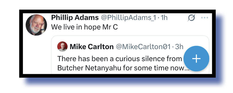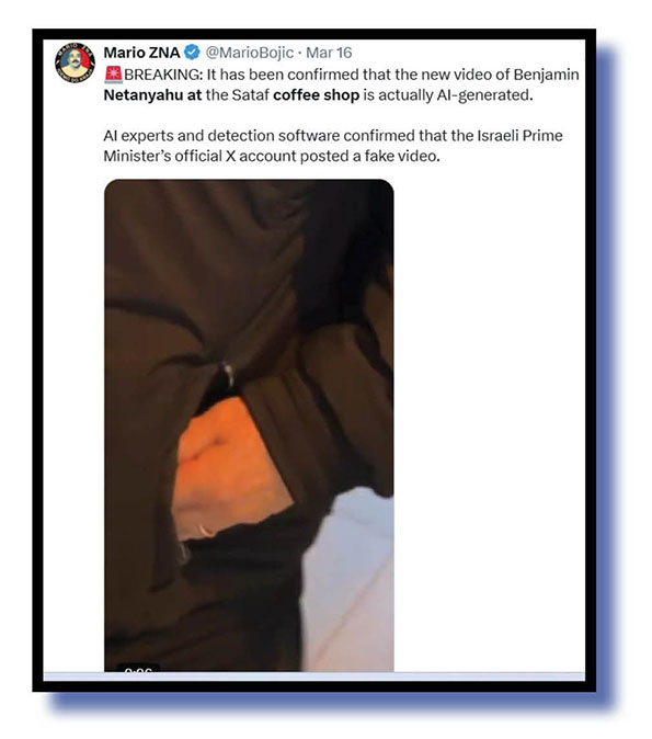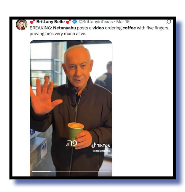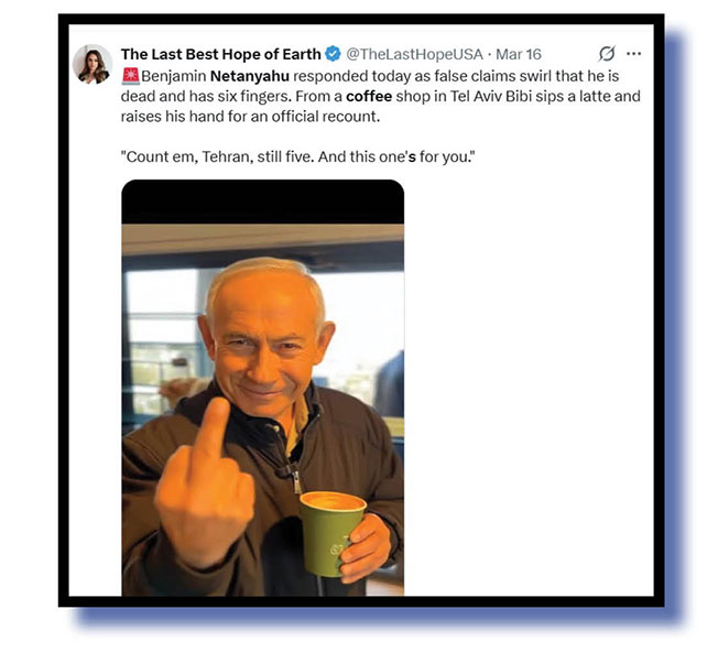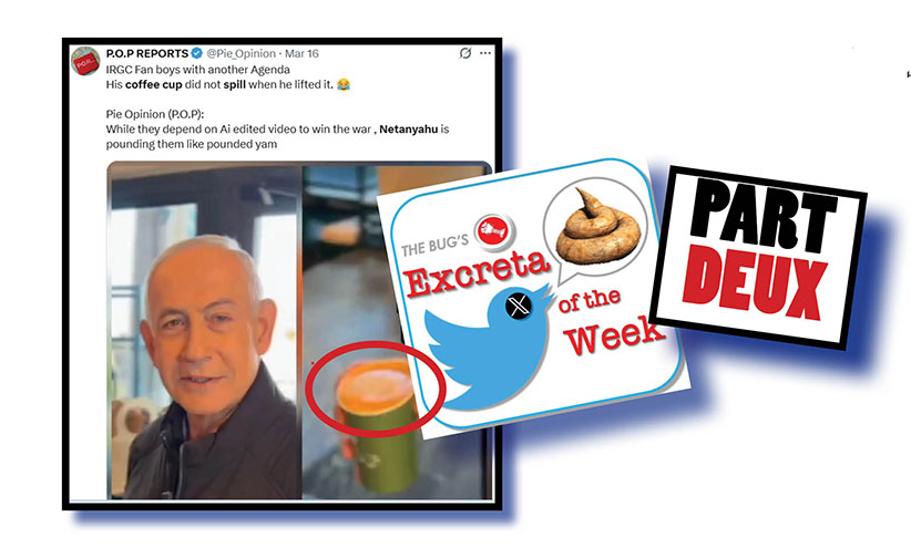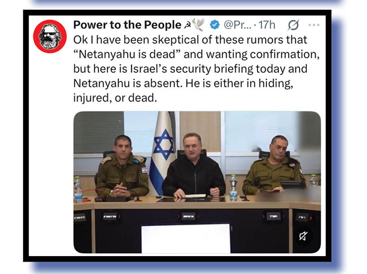 The Bug’s two X sites were awash over recent days with video supposedly showing Israeli prime minister Benjamin Netanyahu was very much alive despite growing rumours Iran had him done and dusted.