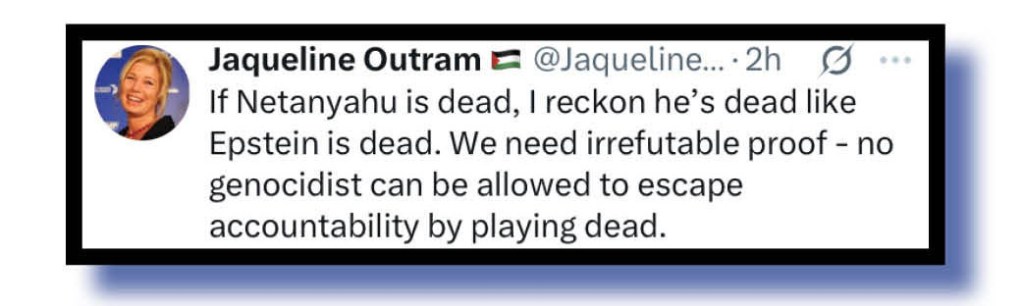 Jew – sorry, true -believers had no doubts whatsoever and Brittany Belle (below)was among the countless Xers rejoicing at the news that genocidal maniac Netanyahu was alive and well and could continue his push for a Greater Israel cleared of sub-human Palestinians.