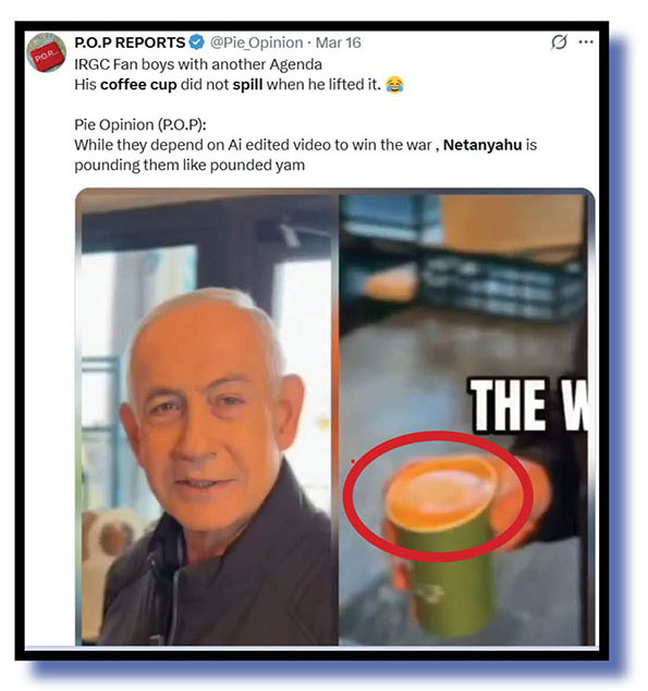 There was Bibi at a Tel Aviv coffee shop showing both hands had just the regular five fingers – or is that four fingers and thumb? – supposedly mocking online claims that the imagery was deceptive AI out to shatter not just Iranian hopes and dreams.