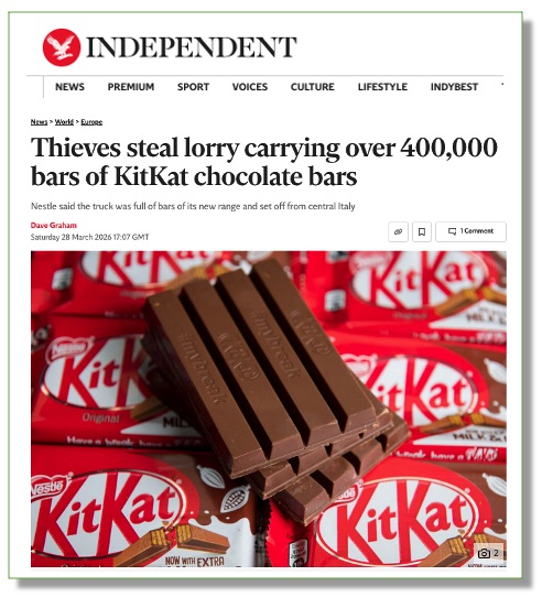 The Nestle chocolate company has reported the theft of more than 400,000 Kit Kat bars while in transit from a factory in Italy to distribution centres across Europe in time for Easter.