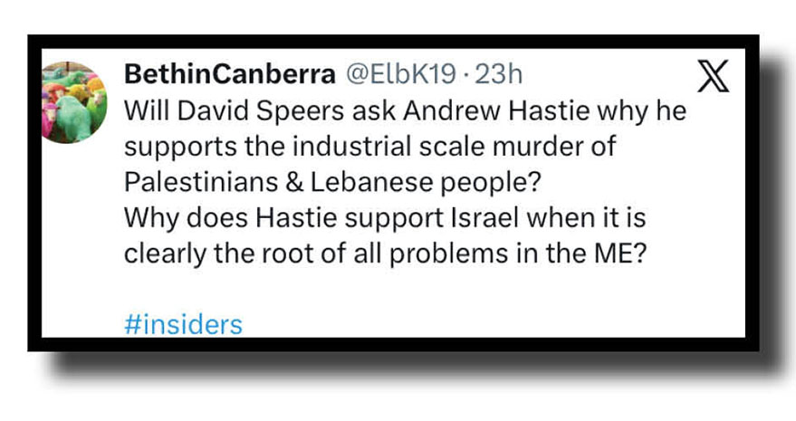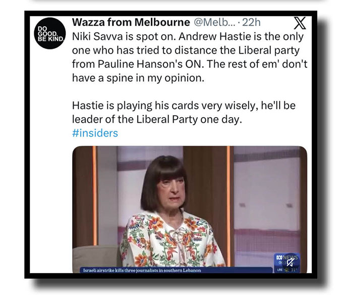 But while we’re mentioning Insiders, here is Wazza from Melbourne on a highly respected scribe and a bloke who might have been a future Liberal prime minister if the Liberal Party had still existed, and BethinCanberra suggesting a question for David Speers before the Sunday show taping.