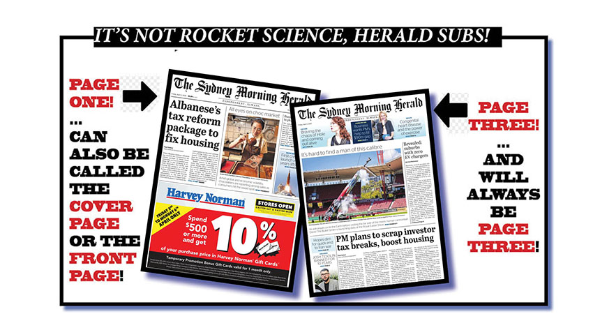 Yes, of all the ways a SMH sub can fuck up when there’s a Hardly Normal wraparound and the fake second cover is folioed as it often is as PAGE 3, the worst and most inaccurate is to say it came from PAGE 1. To say it came from the front page or the cover page are bad enough, but calling page 1 page 3 is monstrously inaccurate, something a metropolitan daily sub should be able to avoid without even blinking. Or thinking. To make things worse, sub fuckups like this one normally happen on Wednesday and Friday shifts. From now on, we’ll also be opening up Friday editions of the Herald with much trepidation.