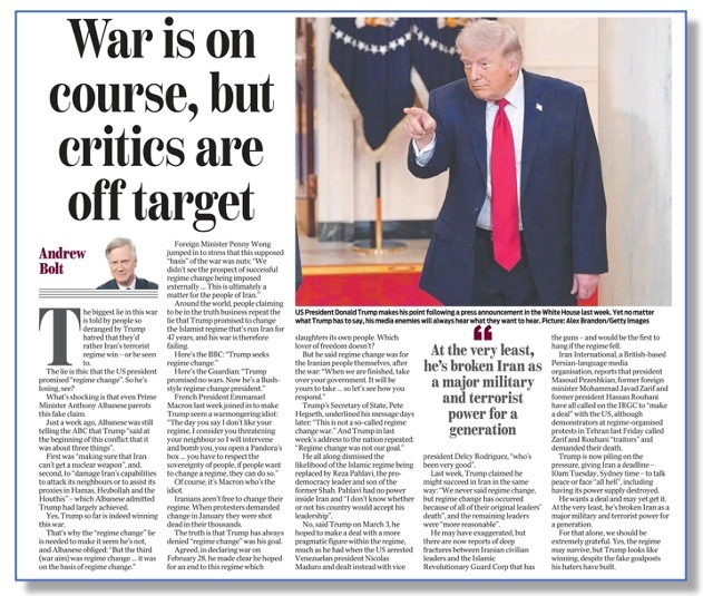 Bolt argued that such critics were peddling a “regime change lie” by arguing that Trump’s war had failed because the Iranian regime still existed and was fighting back against US war crimes – “war crimes” being our MGH teams’ words, not Bolt’s, of course.