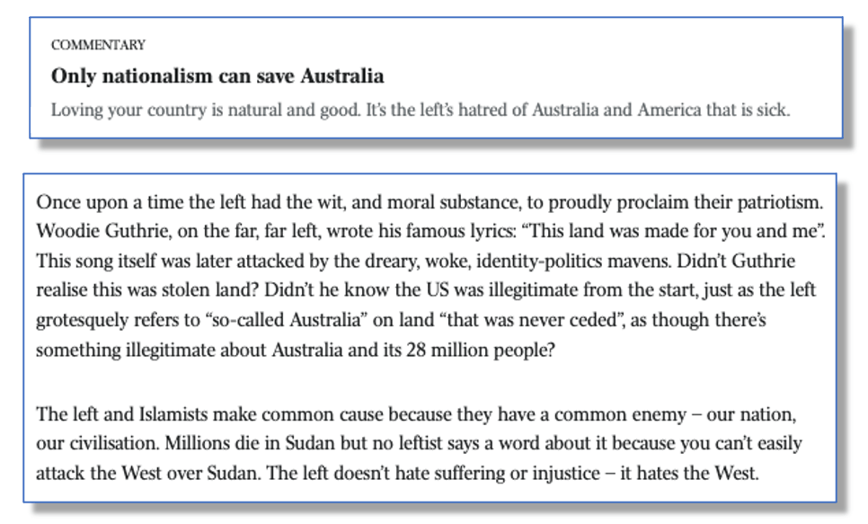 Speaking of the hate media – aka the Murdoch empire – another of its senior Righters was fanning the flames of division through one of his own recent “analysis” columns.