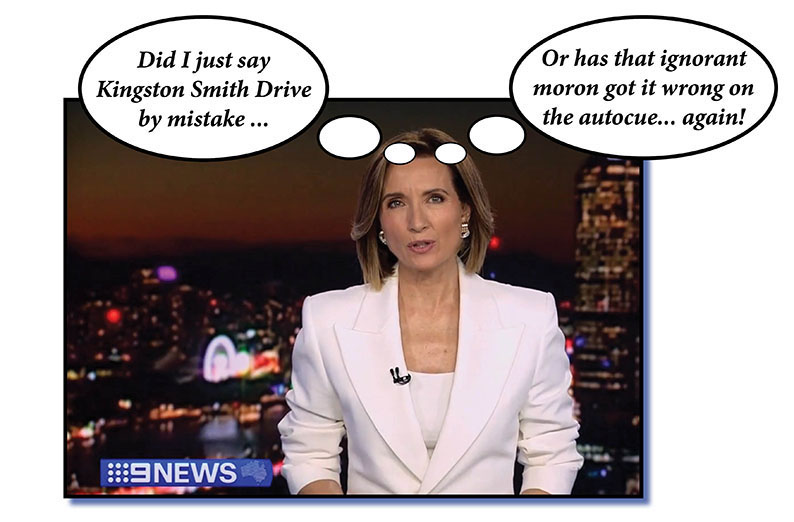 Maybe she was just horse-ing around? A simple slip of the tongue maybe, or as our image (at top and below) suggests, Melissa’s reading skills were of their usual excellent standard and some cretin up at the Nine newsroom does not know the thoroughfare in question – one of Brisbane’s best known – is Kingsford Smith Drive.