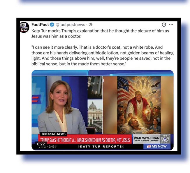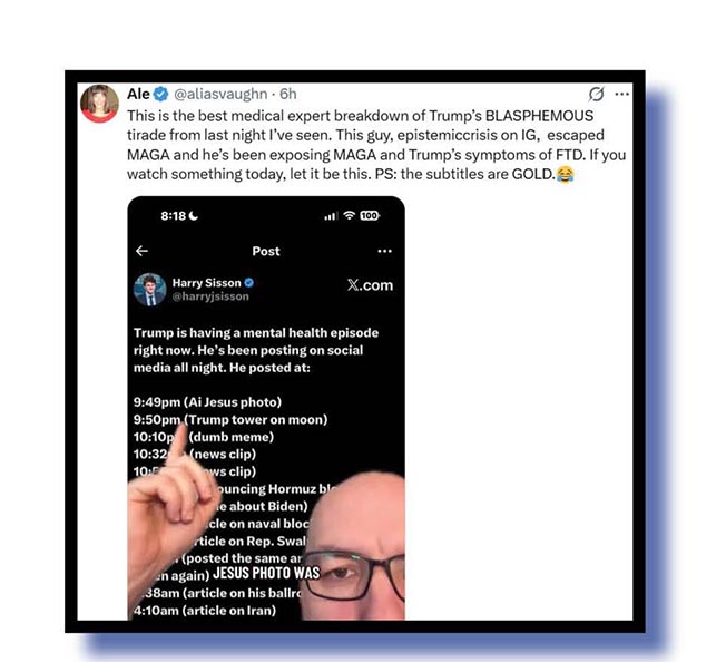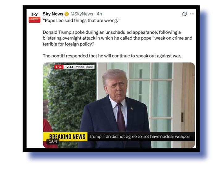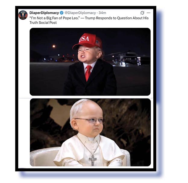 Running parallel with the Moron of Mar-a-Lago’s attempts to explain that he wasn’t Jesus was his run-in with Pope Leo. Here are DiaperDiplomacy with a brilliant meme video that we can’t show unfortunately ‘cos we remain luddites, and Sky News.