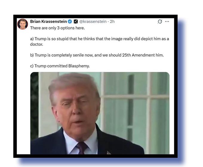 And our judges thought Colin Rugg’s contribution (at top and below) was as good as any to summarise reaction to Donald Trump’s risible claim that a meme he posted showed him as a doctor.