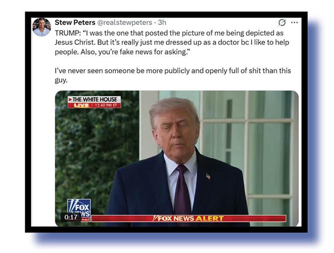 Here’s what Stew Peters, Brian Krassenstein, Factpost and Ale thought ot the Orange Oaf for a post he apparently quickly put down. It seems someone in Demented Donnie’s inner circle has at least two brain cells to rub together. That news might surprise many.