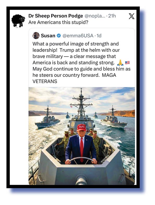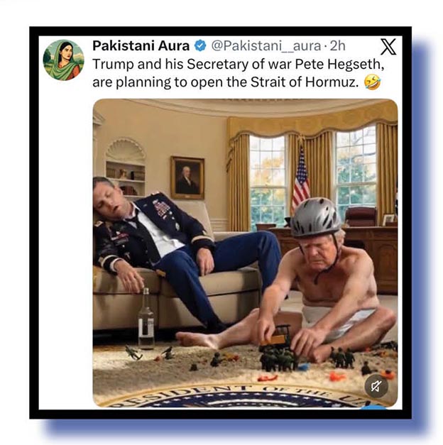 So, as you can see from the contribution from Pakistan Aura (at top and below) we’re still taking the mickey out of the diaper-dependent Orange Oaf and his Secretary of War Seth Pisshead but we’ve moved on from recent XOTW columns that centred on memes showing Trump as either JC or a nurse and his war of words with Pope Leo.