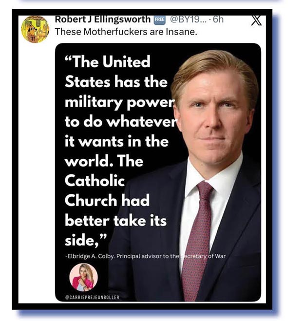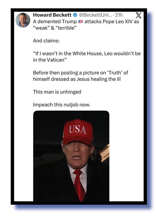 Remember, folks, this is the Mr Colby, principal adviser to the Secretary of War so is it any wonder many of us are waiting for a reasonably priced bomb shelter to appear in ALDI’s bargain bins! And Howard Beckett xcretes on Trump’s attack on “a weak and terrible” Pope Leo XIV. It’s remarkable, isn’t it? Pope Leo is a true lifetime follower of God and a man of enormous standing, decency and compassion and Trump’s diaper – the one that smells like 10 Big Macs have just shit themselves while being drowned in an equal number of Diet Cokes – has more Christianity to it than Trump possesses in his entire body, mind and soul.