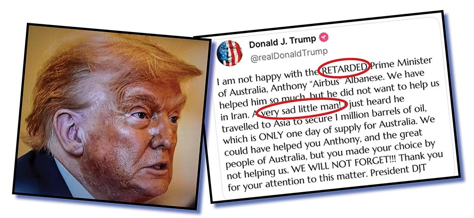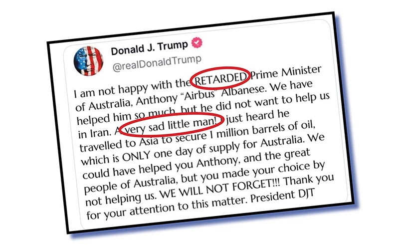 So, my dear and faithful flock, does our Prime Minister Anthony Albanese have what it takes – for the sake of the kiddies present I’ll call them cojones – to respond in a forceful and appropriate way to US president Donald Trump for calling him “retarded” and “a sad little man”?
