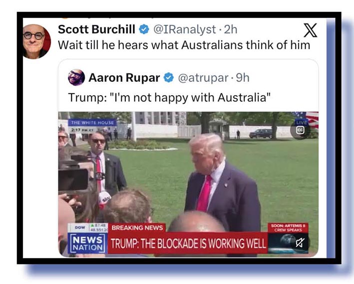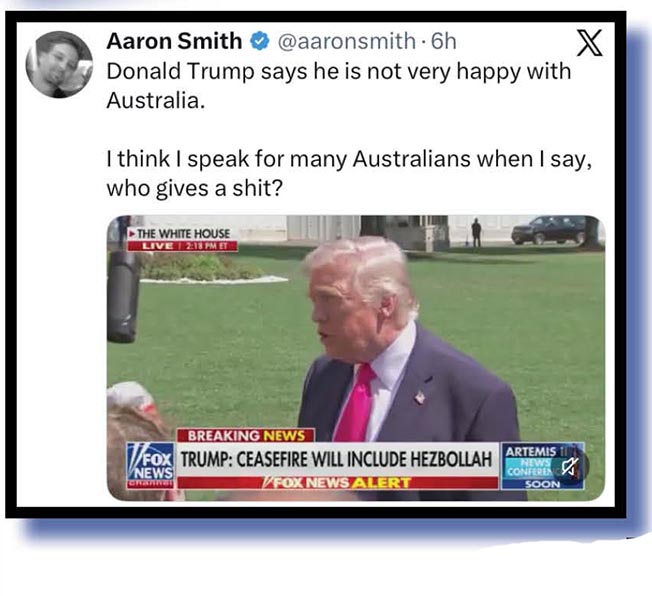 Our reader was probably upset by the latest news out of The Orange Oaf’s lying gob – the one that looks like the busted intake pipe at a sewerage works – that he is very upset at Australia for its lack of support in bombing Iran back to the Stone Ages.