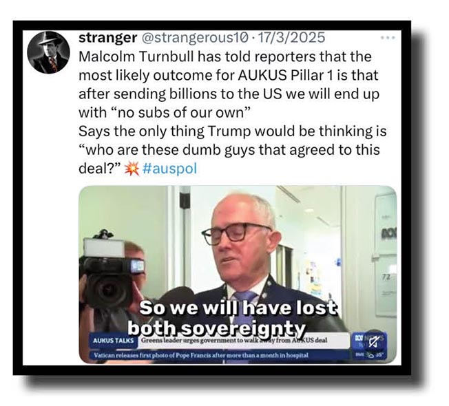 Let’s dive a little deeper now with stranger backing up The Fizza on those AUKUS subs we’ll probably never get, and staying on war toys and such things, is this xcrement from Australia’s leading (and only) national loss-leading broadshit!