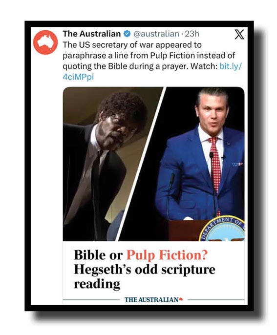 To be fair, anyone can mix up biblical quotes from Pulp Fiction and the world’s biggest selling work of fiction ever, the Bible, especially if you’re Seth Pisshead! But well done to the Oz for using Pisshead’s official title and not defense secretary. We should always mention it when The Australian gets things right instead of just far-right.