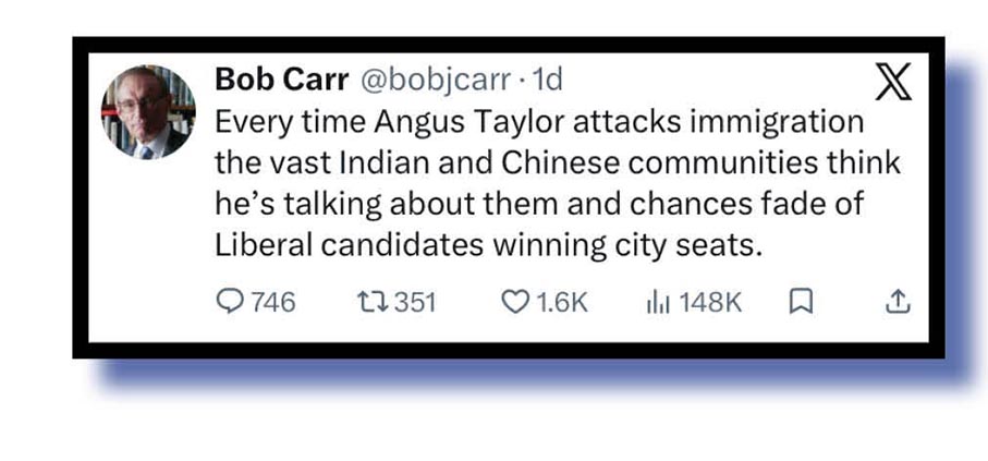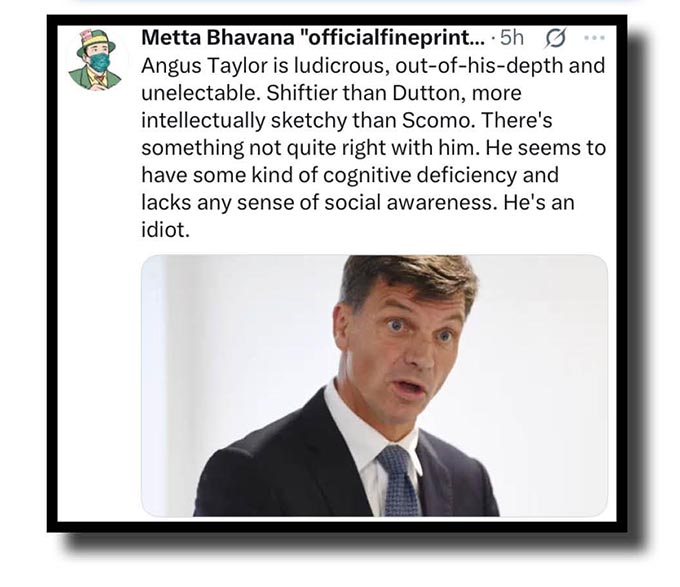 Another current and far-from shining light in Australian politics is of course chuckle-inducing Anus Taylor – we really must find out the date, time and place of his upcoming standup performances because we’re told he’s best seen live – but in the meanwhile, here’s Bob Carr and Metta Bhavan “officialfineprint…