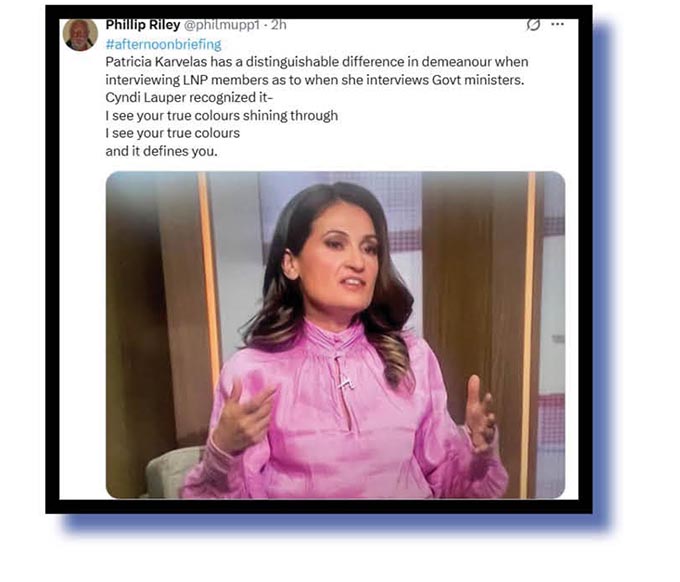 Let’s finish off with some xcreta on our woeful mainstream mediocre. We have no idea why Patricia Karvelas often cops a cloacal covering, such as this effort from Phillip Riley….
