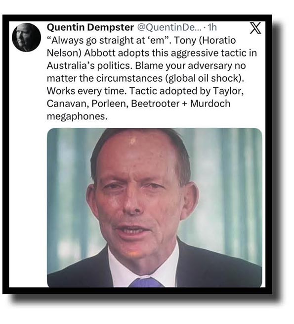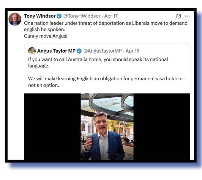 And we couldn’t leave Australia’s incoming prime minister at the next election out of the mix, could we? So here’ a fine cloacal covering on the national leader of the white indigenous One Nation peoples from some chap named Tony Windsor.