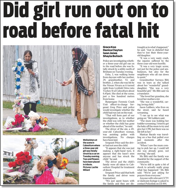 But speaking of missing punctuation, our MGH teams were intrigued by the headline on the story in The Courier-Mail below of the tragic death of a young girl hit by a car.